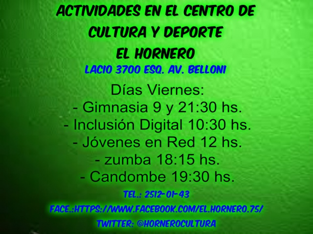 Compartimos información actual de las actividades que se realizan semanalmente en el Centro Cultural y desde ya extendemos nuestra cordial invitación a que se hagan presentes y participen también.