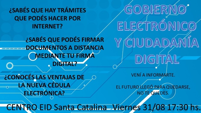 El Viernes 31 de Agosto a las 17:30hs en el Centro EID de Santa Catalina se llevará a cabo una charla abierta para todo publico mayores de 18 años. Con el fin de informarle a la población sobre la existencia de la pagina web del Estado, tramites.gub.uy.