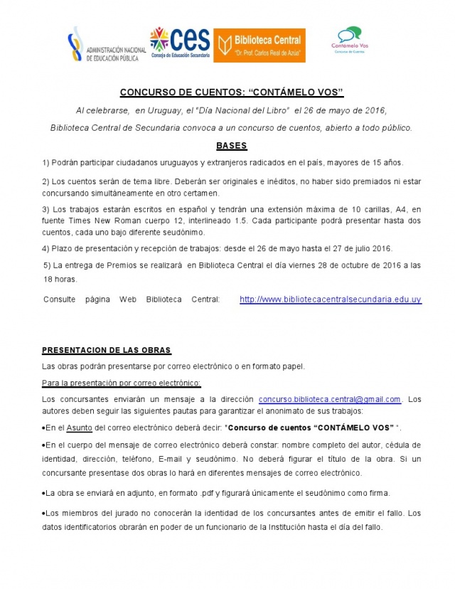 Biblioteca Central de Educación Secundaria los invita a la presentación del CONCURSO de CUENTOS “Cuentámelo Vos”