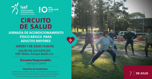 El 7 de julio a las 15.30 horas en el Salón de los Espéjos de ISEF Parque Batlle tendrá lugar la Jornada de Acondicionamiento físico para adultos/as mayores: circuito de salud