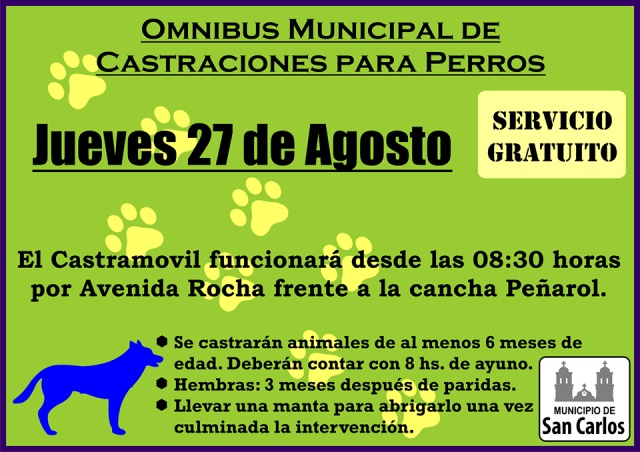 Nuevamente la unidad móvil de castración para perros estará en San Carlos.