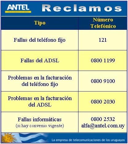 Ir al listado de noticiasPor tratarse de un tema de interés para los distintos infocentros comunitarios, les recordamos los números telefónicos de ANTEL a los que corresponde llamar en caso de reclamos de distintos tipos:
